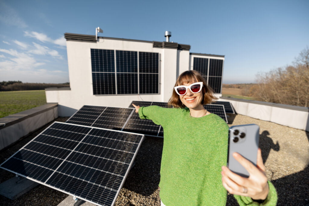 Young woman talks on phone while standing on rooftop with a solar power plant. Happy owner of energy-independent household. Eco-friendly and sustainable lifestyle