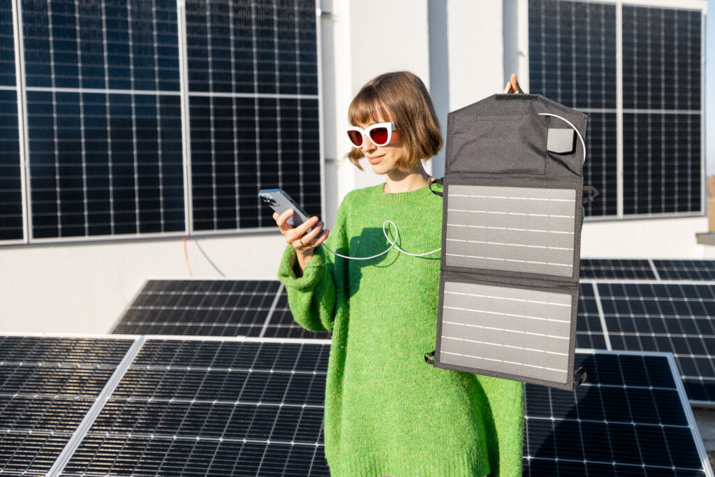 Young woman charging phone from a solar portable panel while standing on rooftop with a solar power plant on it. Concept of alternative energy and new technologies